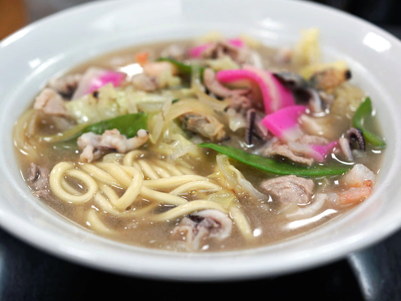 長崎ちゃんぽんの割にスープがサラリとしてて、甘み控えめ。塩の風味がかなり強くて味の輪郭がはっきりしてる。太いストレート麺もスベスベと、ボクの好みでかなりおいしい。オキニイリ。