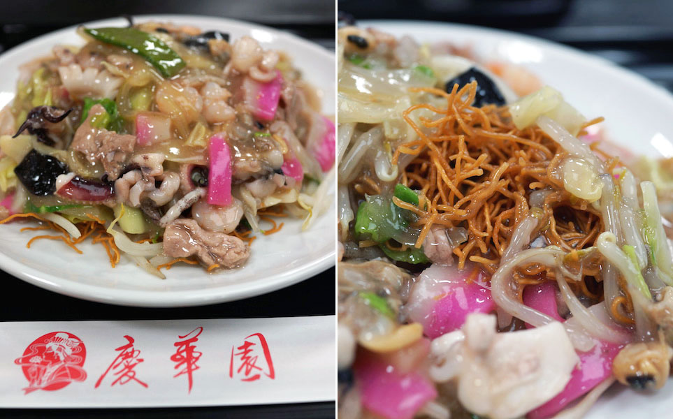 皿うどんは残念ながら、揚げたパリパリの細麺しか用意がなくて、それでもいいかとたのんでみれば、これが驚くほどに具だくさん。