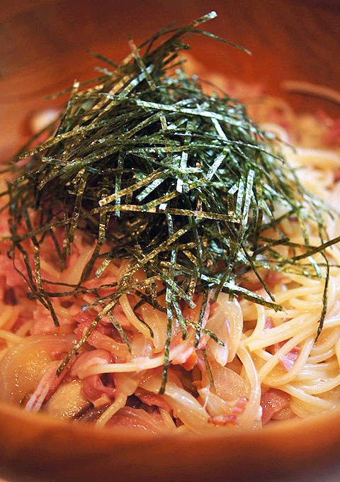 壁の穴風の木のボウルが一層、明太パスタをおいしそうにみせるのですね。