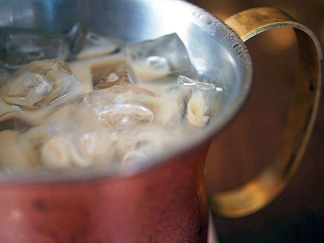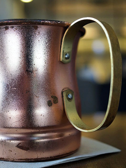 ココの冷たいコーヒー類は、真鍮製の金属マグでやってくる。