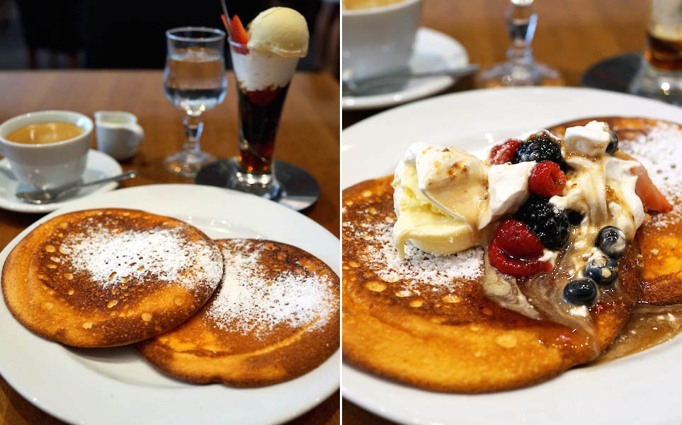 別添で小さなパフェがやってくる。アイスクリームにホイップクリーム、 ブルーベリーにラズベリーとそれだけで十分立派なパフェなんだけど、それをザザッとパンケーキの上に移してソースの代わりにしながら味わう趣向。