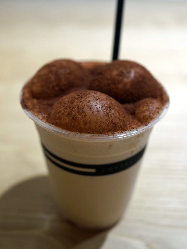苦味ではなく豆の甘みと旨みを上手にひきだすタイプのエスプレッソ。それをミルクとカップに注ぎ、上にコーヒーパウダーをタップリのせて覆ってやると、行き場をなくした泡がたまってブクブク大きなアバタを作る。
