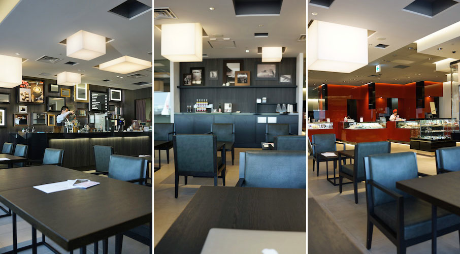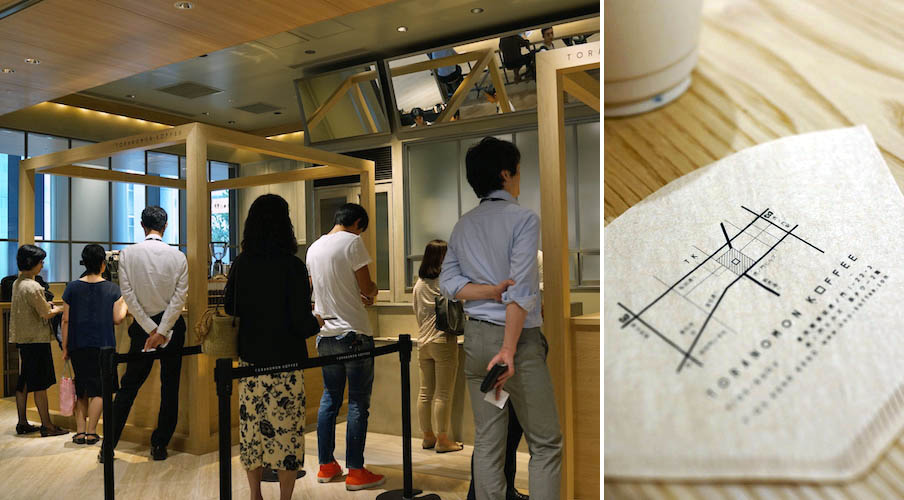表参道のその店は、日本家屋の居間のところに立方体の木枠を組んで、茶室を模したエスプレッソカウンターを作っていたのが特徴的。その立方体の構造をそのままオフィスビルのロビーに移して作ったオモシロイ店。