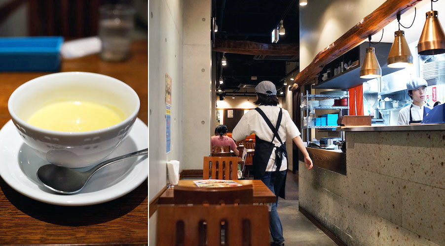 たのんだメインがやってくるまでコーンポタージュを食べて待つ。それが期待以上においしくてびっくりしました。科学の力は見事なり。