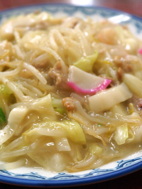 茹でたちゃんぽん麺を油でチャチャッと炒めて、そこにあんかけ。ポッテリとしたとろみあんかけの中には野菜や具材がタップリ。