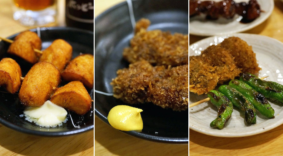 豚バラ肉の串かつやしいたけフライもこんがりうまい。