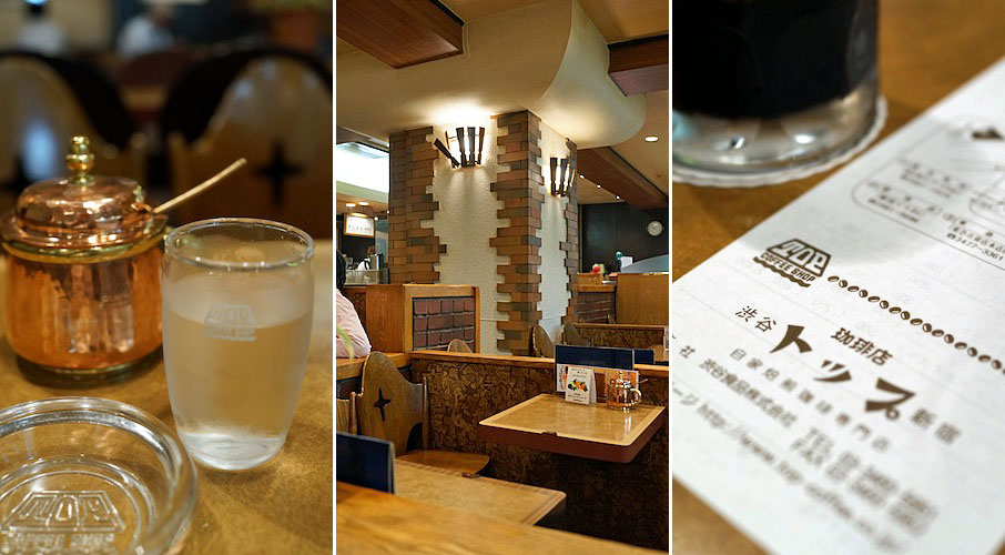 新宿西口、都庁に向かって伸びる地下街を歩いていくと左手にある喫茶店で、レンガ造りの昭和風情なインテリア…、ガラスの灰皿、ブラスのシュガーポットにグラスとすべてがキラキラ、ピカピカしている気持ち良き店。