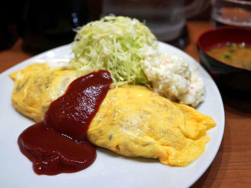 その分、トロンとオムライスからお皿に流れて模様を描くケチャップが、色鮮やかで食欲そそる。黄色い玉子、程よく薄さに焼けていて、くるんだ中のケチャップライスの色がほのかに透けているのが、またおいしそう。