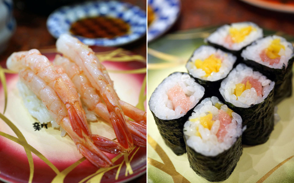 60人ほどが座れるベルトの中に握り場5つ。ネタがそれぞれ分散していて、だから互いに声掛け合って、寿司をにぎって提供する。