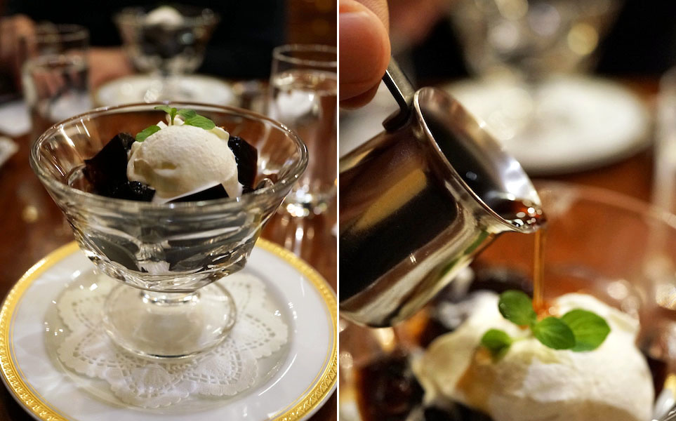 金箔で縁を飾った下皿に、ズッシリ重たい銀のスプーンを従えて、ガラスの器の中にコーヒーゼリーとクリーム。ミントの葉っぱもすがすがしくてこれがおいしい。
