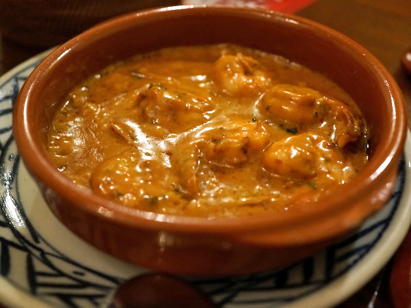 エビの殻からとったうま味ジュースを、バターやクリームと一緒に煮詰めてトロミをつける。ガーリック風味に仕上げたエビにそれをタップリからませたもの。