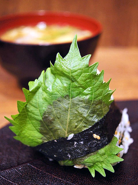 色鮮やかな大葉の裏に、醤油まみれのおかかがひそんでいるんでしょうか…、色が滲んでそれが食欲、なおさらそそる。