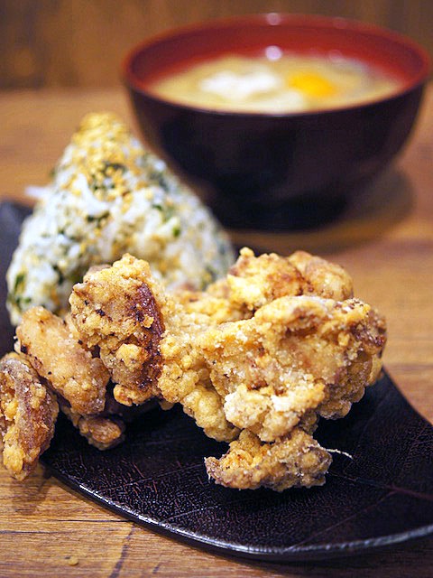 お店の中で食べますから、ってお願いをして、一緒に鶏の竜田揚げ、豚汁もらってお盆に並べて今日のご飯が一揃え。