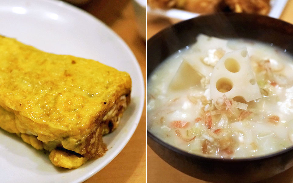 ゆし豆腐を出汁で伸ばして汁として、固めに茹でたれんこんと一緒に煮込んでみょうがを添える。