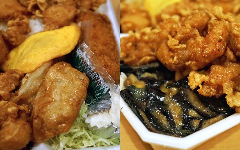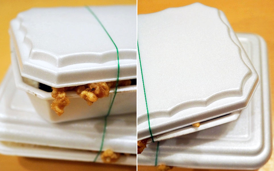 手渡されたビニール袋を手にすると弁当2個とは思えぬ重さ。取り出してみたらばパッケージの蓋もできないくらいに山盛り。ところどころがはみ出している。
