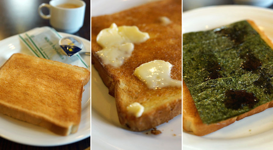 半分に折り、パクリと食べるとカサカサ乾いた食パンに海苔の風味が混ざってなんとも味わい深いオモシロサ。磯辺焼きみたいな味がするのに、あくまで食感トーストで、バターのコクもドッシリしてる。カフェオレ一緒に飲みながら、今日も1日がんばりましょうとニッコリ笑う。さぁ、仕事。