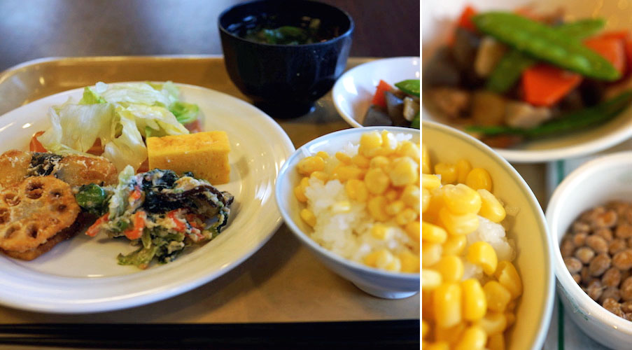 料理をあれこれ。中でも白和えが美味しげでそれをメインにお皿にもって、ご飯の上にコーンをタップリ。ホツホツとしたみずみずしさをたのしみ、味わう。