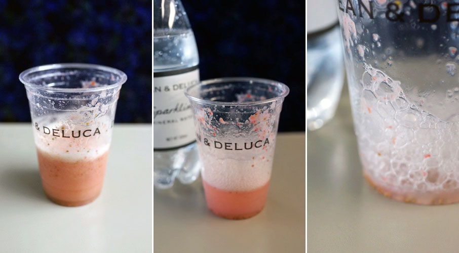 ユックリ、じっくり味わってたら電車の時間がやってきて、飲みかけカップを持って急いで電車に乗った。旅のお供にと買ってきたクラブソーダを飲みかけカップにトクリと注ぐと、ジュワジュワ音を立てながら細かな泡が湧き立って、イチゴソーダの出来上がり。