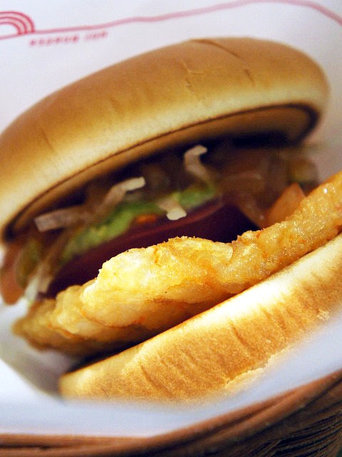 トマトを抜いて食べると量が半分くらいになっちゃうけれど、エビとバンズとソースのバランスがとてもよくなる。