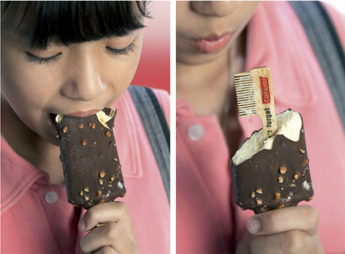 ズンズン、アイスクリームを食べていくとバーがちょっとづつ出てくるのだけど、それがなんと「歯ブラシの形」をしている…、という工夫。