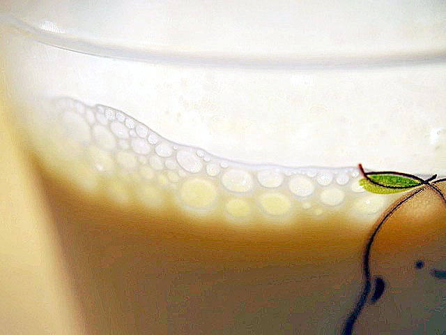おそらく搾った豆の汁ならではのタンパク質が泡を頑丈にしているんだろうと思うのですネ…、なかなか泡が消えないで最後の最後までカップの中が泡だらけ。