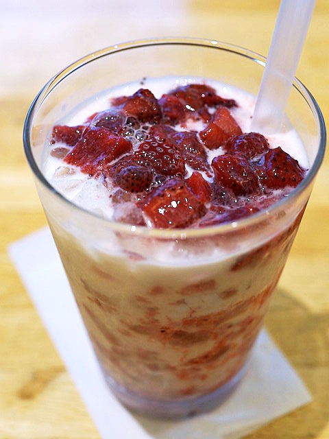 凍ったイチゴをザクザク崩し、イチゴジェリーと一緒にミルクで割ったもの…、イチゴに練乳かけて潰して食べていた、いちごミルクの凍ったバージョン。