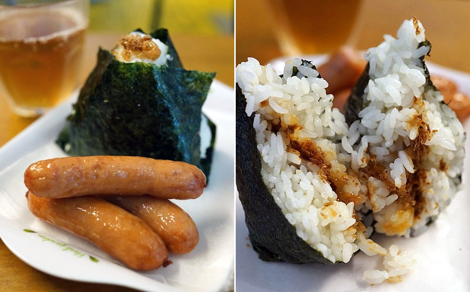 梅とおかかのおむすび一個…、それにソーセージのフライをセットでもらって食べる、キリッと酸っぱい梅干しが口の中を一気にみずみずしくしてくれて、おかかのうま味が酸味をしっかり受け止める。