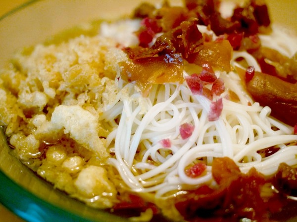 カリカリ梅を細かく刻んで、パパッと散らし、天かす添えて出汁をタップリ。