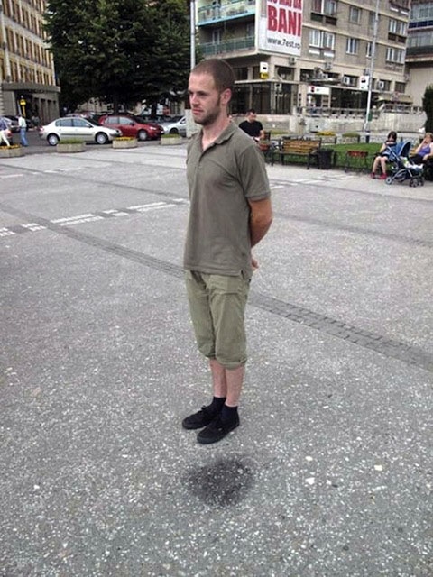合成でもなんでもなくて、彼が立っている場所の斜め横に彼の体の形の影を書いただけ。