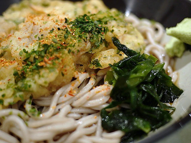 冷たい天ぷらそばをネギ抜き、ついでにワサビ多めにしてもらって朝とします。