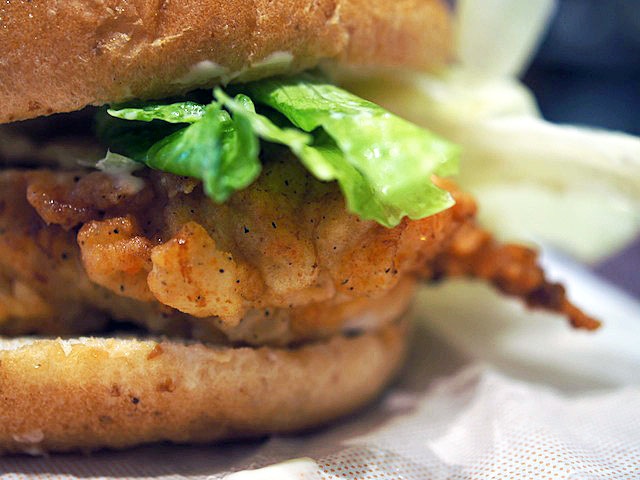 お昼のかわりにチキンフィレサンドイッチをたのんで食べる。