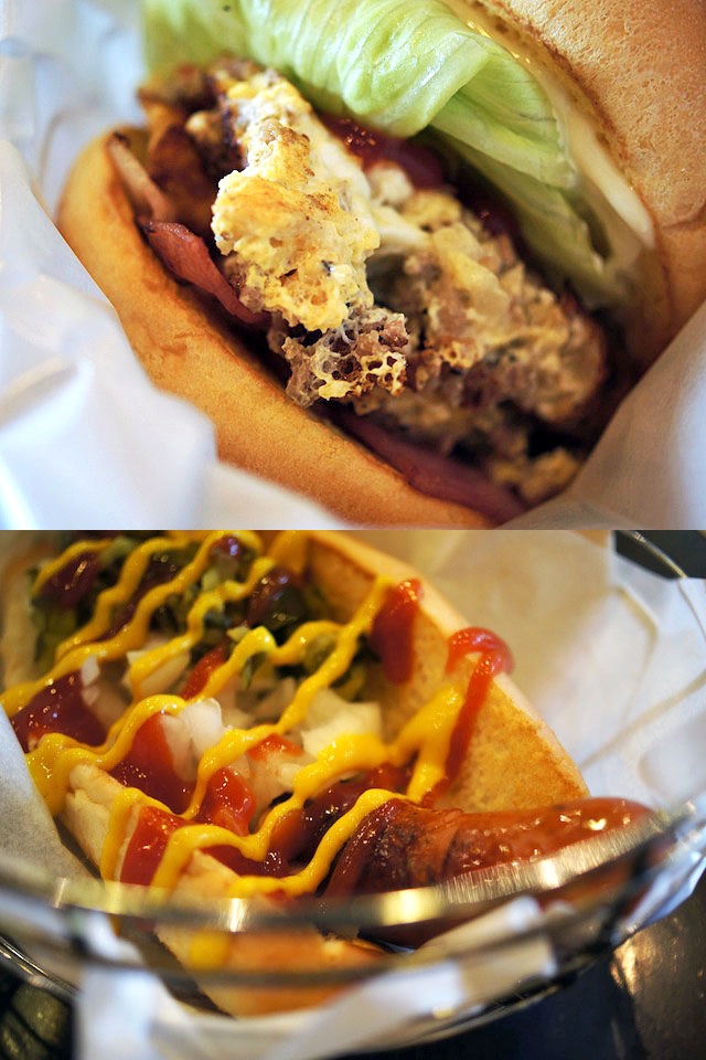 ベーコンオムレツバーガーが、ちょっと無残な姿で下がる。