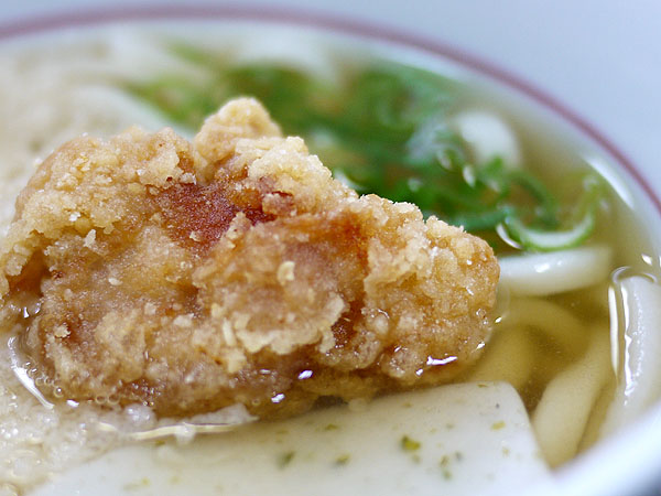 うどんの上に唐揚げ乗っけて、唐揚げうどんにしてみます。