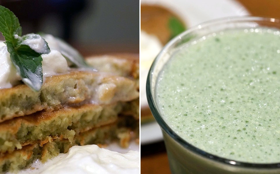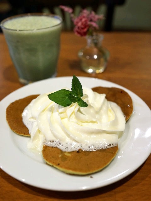 そして今日の朝ご飯…、グリーンパンケーキっていうのをたのむ。
