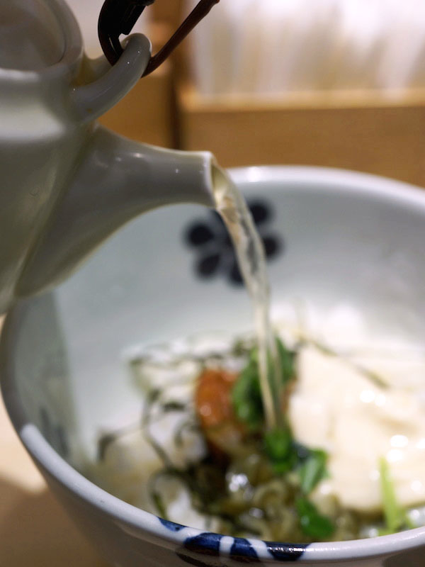ただ、お昼以降のここの茶漬けは、具材が立派でまず出汁をかける前に、ご飯とおかずでたのしみたくなる。けれどさすがに朝のコレ。明らかに茶漬けの具材って内容、そしてボリュームで迷わずササッと、出汁かける。