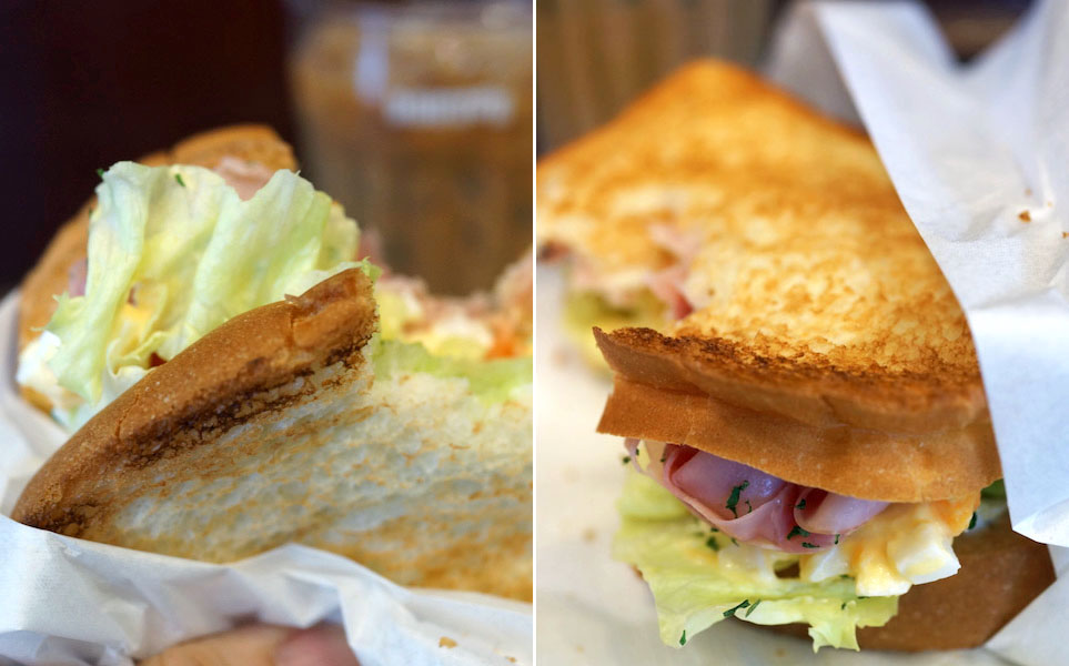 パンはおんなじ。焼かれ具合もおんなじで、ハムにレタスに卵サラダと中に挟んだ具材も同じ。