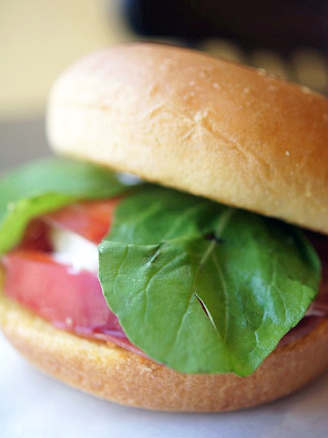 あまりの美味しさに自分でも再現したくて、かぼちゃバンズを焼いて家でも作ったのです。普通のバーガーのパティに比べて、再現しやすいのがよいところ。ハモンセラーノにマスカルポーネ、トマトに、当初はルッコラだったような?