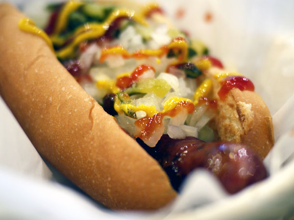細かく刻んだピクルスとフレッシュオニオンがソーセージの上にちらかる、そのシャクシャクがとてもおいしい。