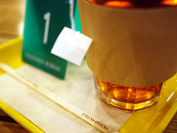 ホットティーを選ぶとグラスにお湯とティーバッグ。