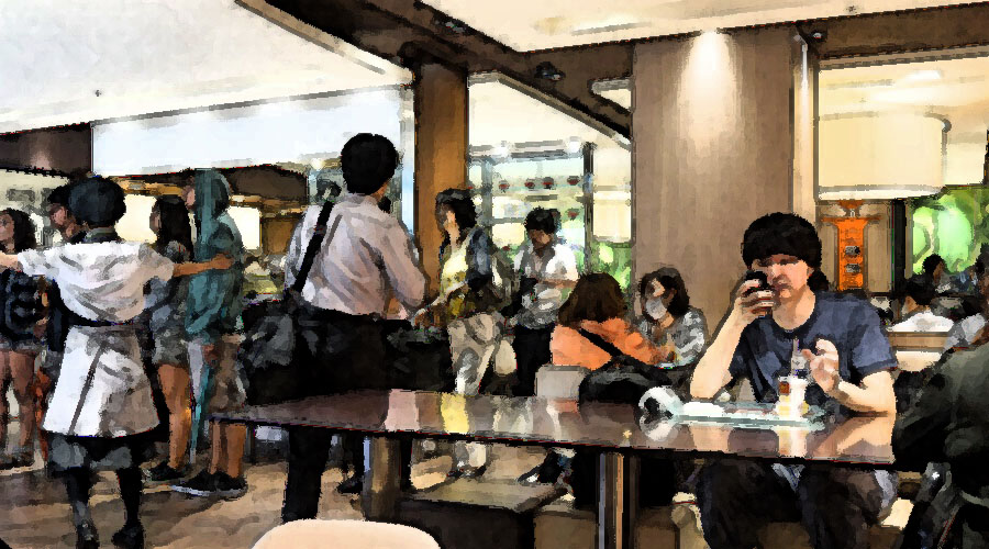 テキパキ、トレーの上の食べ物をお腹の中におさめて、さてさて、仕事に向かっていきましょうか…、と立ち上がろうとしたら突然、グループ客がゾロゾロお店にやってくる。