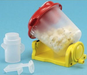 電子レンジからポップコーン製造容器をとり出して、ハンドルつきの台に置き、シロップや調味料を入れたシリンダーをセットする。