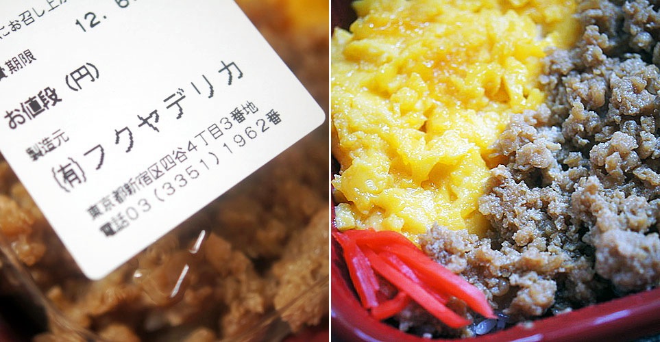 棚においてあったのは二色ご飯…、鶏のそぼろと炒り玉子、これに青物…、例えばグリーンピースやさやえんどうを炒めたモノが入っていたらば、小学生の頃、お弁当に作ってもらって一番うれしかった「三色ご飯」になりそうなコレ。