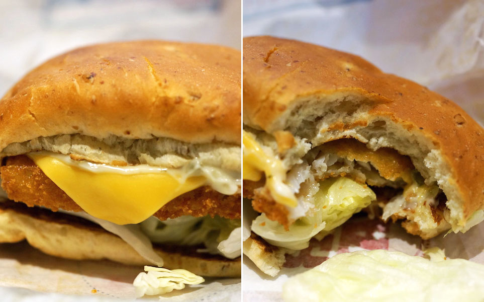 四角いバンズ。ふっかりしていて粘らない。口の中でバサバサ散らかり、フィッシュフライを受け止める。