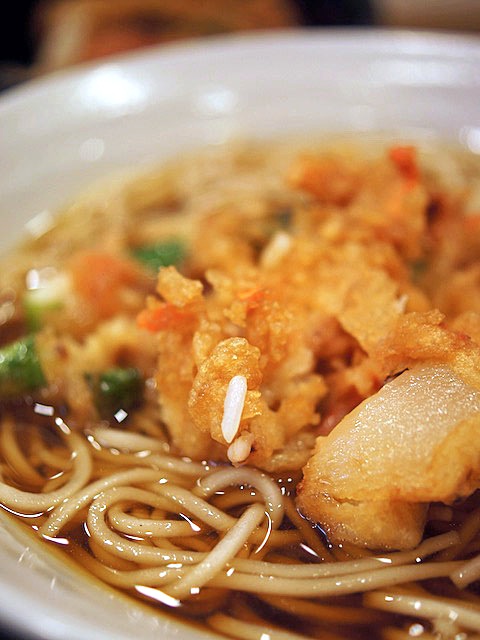 甘辛ダレをたっぷり吸ったかき揚げですゆえその出汁の味がでて、すっきり味のスープをコッテリ、おいしくさせる。