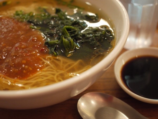 なるべくペーストをスープに溶かさぬようにして、辛辛麺とやさしい麺とを行ったり来たりしながら食べる。