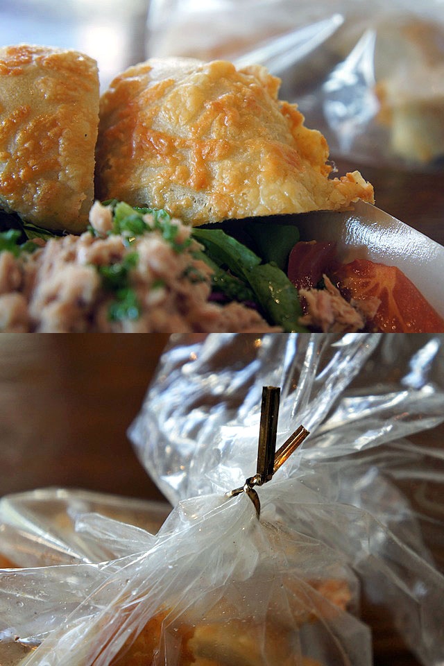 それだけ食べると口の中の水気が取られてもさっとするけど、そこに葉っぱやトマトを足すとツナペーストのようになる。
