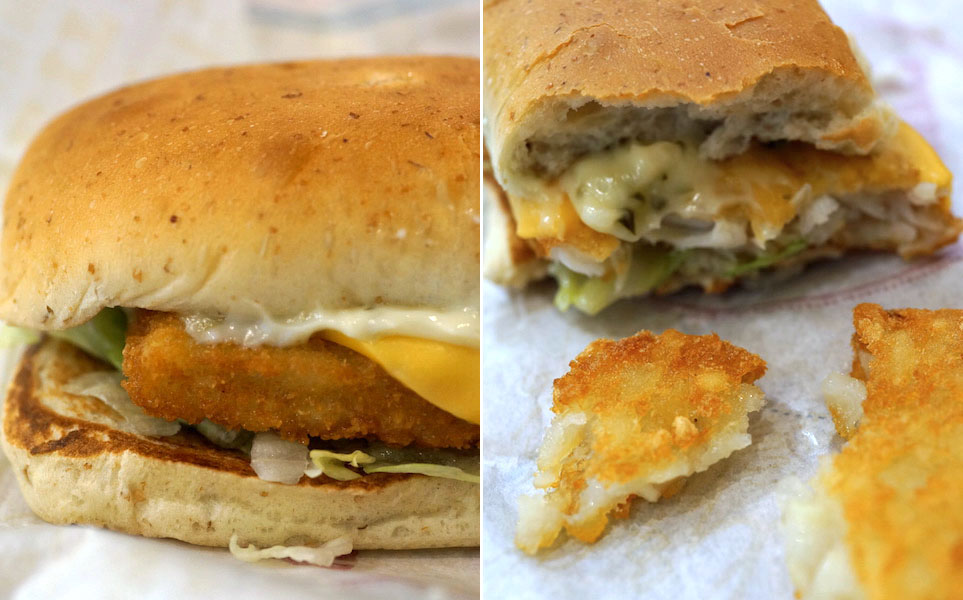 フィッシュフライを挟んでタルタルソースで食べるサンドイッチ。チーズもとろけて、食べた直後のカサカサ感がどんどんトロンとなめらかになる、その食感の変化がたのしいオキニイリ。