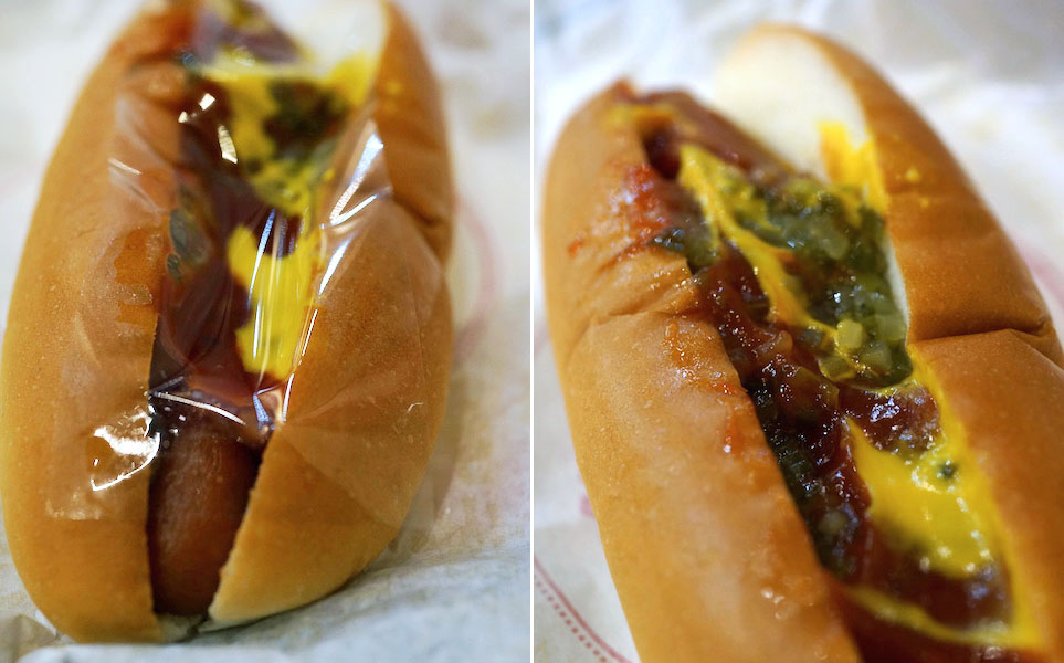 ホットドッグはラップ素材をペロンと剥がして食べるタイプ。マクドナルドもこんな具合で、紙でくるんで提供しさえしなければ、いらない手間。