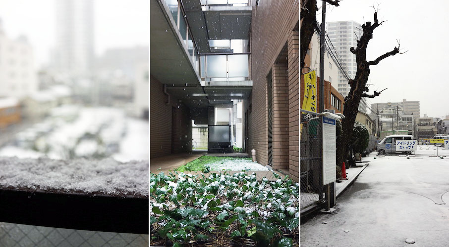 濡れて重たい雪のコト。歩くとシャリシャリ、靴の下でシャーベット状になっていくのがうれしいようで、滑らぬようにと身構え歩く。
