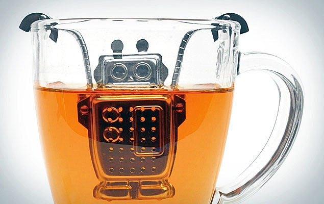 ティカップの縁を両手をガシッとつかみ、お湯の中にぶら下がるロボット型のガジェットでお腹の中にタップリ紅茶の葉っぱを格納…、お茶を出しますという趣向。